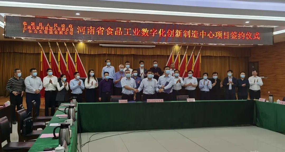 为推动河南省食品工业的数字化发展,形成领先全省的坚实产业集群,河南省漯河市临颍县委、县政府联合上海发那科机器人有限公司与广东力生智能有限公司,一同发起成立“河南省食品工业数字化制造创新中心”,并于2021年5月15日在临颍县委礼堂隆重举行了制造创新中心项目签约仪式。